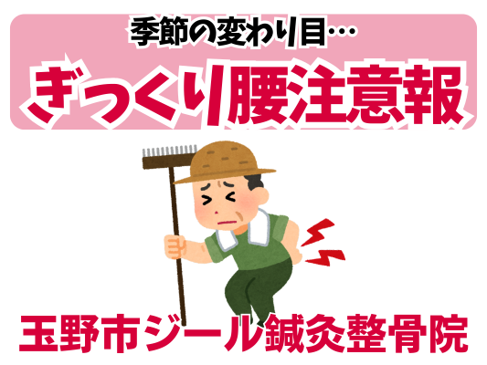 玉野市田井のジール鍼灸整骨院でも、ぎっくり腰や慢性腰痛の患者様が増えています。
